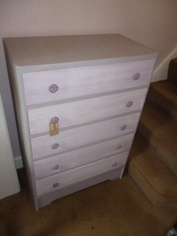 5 drawers of the same size painted in Annie Sloans Old White and colour washed with Emile. The body is in Paloma, a beautiful pink based grey. We replaced the top, it was the only part that seemed to have been used?! We've upcyled the original drawer handles with a mix of Emile, Old Violet and Old White then clear waxed.