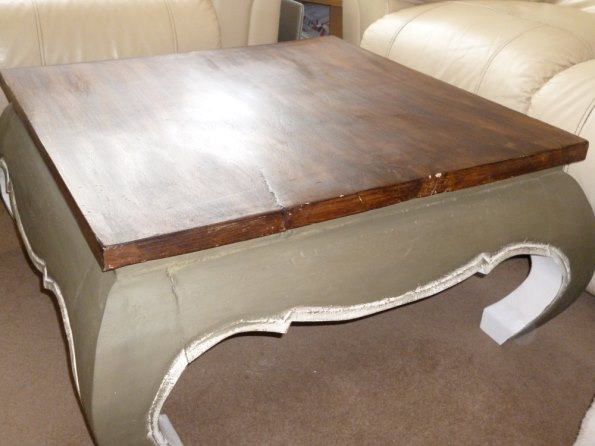 It's an Indonesian opium / coffee table, hand carved from reclaimed teak. We've painted it in Annie Sloan Olive with Old White detail for the 'trunks'. The top is unpainted, but coated in dark wax. A total one-off.