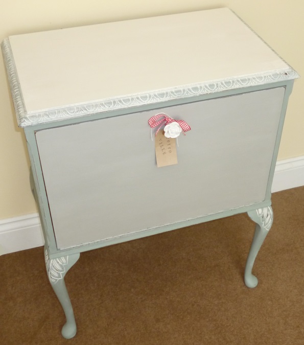 A pretty cupboard in Duck Egg Blue, Paris Grey and Old White then clear waxed and lightly distressed. The handle is a porcelain Old Rose. The door pulls down to reveal good cupboard space. The detail on the legs and top edges have been picked out in Old White. It's ideal to stand a small tv on or for use as a drinks cabinet or maybe to house a hi-fi system which was probably it's original purpose.